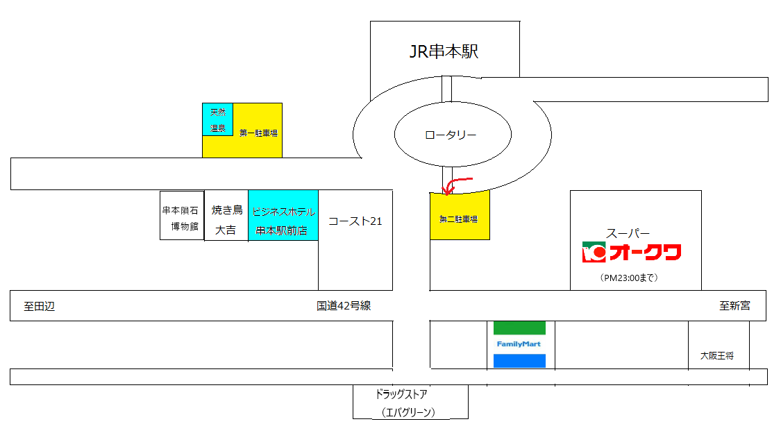 ◇JR串本駅より徒歩約30秒です。無料駐車場完備(ホテル前第一駐車場と駅前第二駐車場があります。)全長7m以上の車は不可